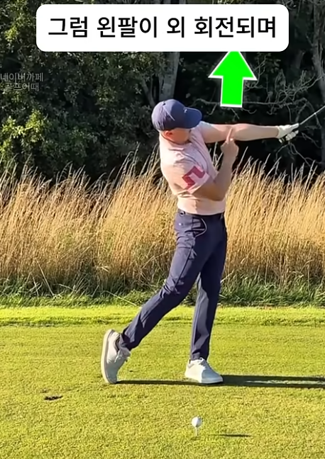 - 왼팔이 외회전되며 넓은 아크를 그릴 때 클럽이 자연스럽게 던져지며 릴리즈가 발생합니다.