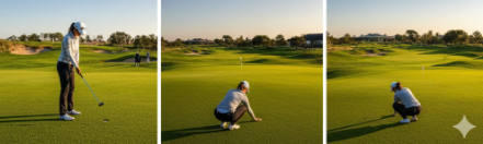 라이를 읽을 때는 무조건 홀 뒤에서 보는 것이 아니라, '낮은 곳'에서 보는 것이 가장 정확합니다. 오르막 라이라면 홀보다 낮은 쪽에서, 내리막 라이라면 반대편 낮은 쪽에서 라이를 확인해야 경사의 흐름을 더 명확하게 파악할 수 있습니다. 프로들은 볼 뒤, 홀 뒤 뿐만 아니라 볼과 홀 사이의 '중간 지점'에서도 오르막/내리막 여부와 경사의 변화를 확인하며 꼼꼼하게 검토합니다. 특히, 롱 퍼팅의 경우, 가장 먼저 할 일은 '어떤 속도(스피드)로 칠 것인가'를 결정하는 것입니다. 볼 속도에 따라 라이를 타는 정도(브레이크)가 달라지기 때문입니다. 속도를 결정한 후, 그 속도에 맞는 커브를 예상하여 볼이 홀컵에 진입할 '입구(게이트)'를 정하고, 그 방향에 맞춰 에이밍하는 순서가 정확한 그린 공략법입니다.