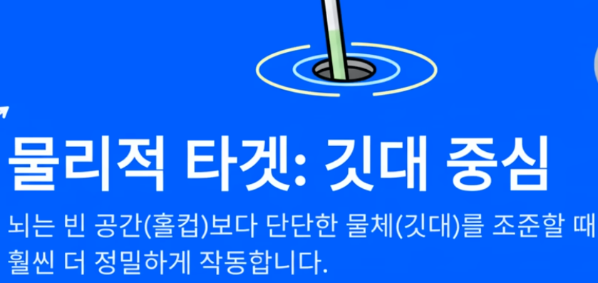 - 우리 뇌의 시각 시스템은 넓고 텅 빈 구멍(홀컵)보다 좁고 명확한 실체(깃대/핀)에 초점을 맞출 때 훨씬 더 정밀하게 작동합니다. 기대의 중심은 목표 지점을 선명하게 인지하게 하여 조준의 일관성을 높여줍니다. 이는 심리학적으로도 조준에 대한 확신을 주어 긴장감을 낮추는 효과가 있습니다.