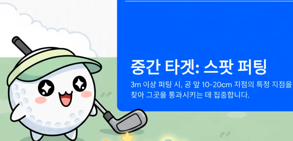 3m가 넘어가는 긴 퍼팅에서는 저 멀리 있는 홀컵까지의 모든 변수를 계산하려 하지 마십시오. 복잡함은 실수를 낳습니다. 대신, 공에서 20~30cm 떨어진 지점의 작은 풀, 흙 등을 **'중간 타겟'**으로 설정하고, '나는 저기만 통과시킨다'고 목표를 단순화하세요. 이렇게 목표를 바꿔 버리면 뇌의 부담이 확 줄어들며, 짧은 퍼팅을 하듯 안정적인 스트로크를 구사할 수 있게 됩니다. 이는 장거리 퍼팅 성공률을 높이는 고수들의 비밀 전략입니다.