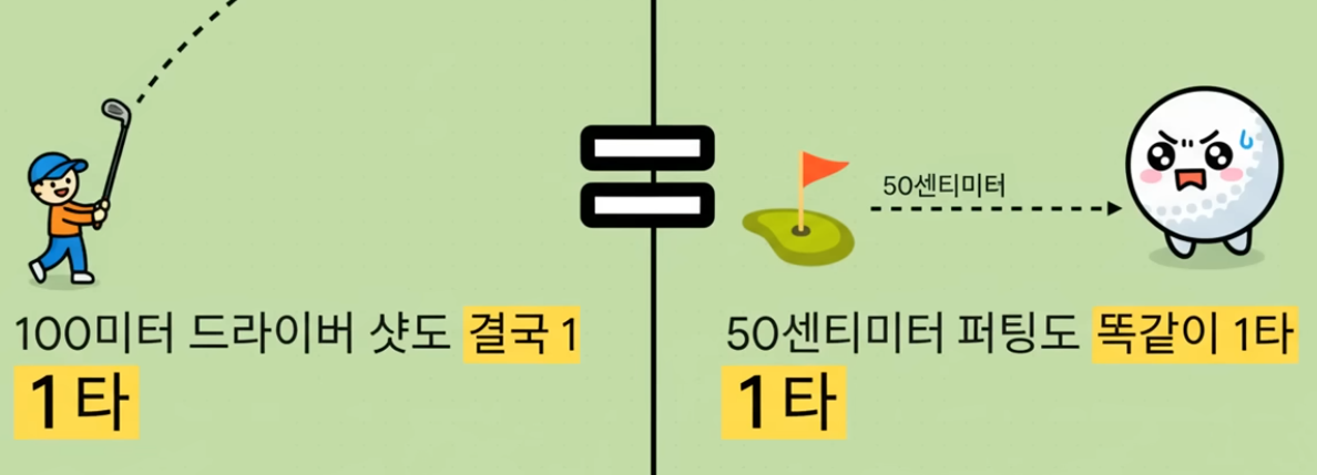 - 냉정하게 말해, 아무리 멋진 샷을 날려도 결국 홀컵에 넣는 것은 퍼팅입니다. 스코어 카드는 1타의 가치를 모두 동일하게 봅니다. 1m 숏퍼팅 성공은 2타를 줄이는 효과(다음 퍼팅을 막는)를 가져오며, 이는 경기 전체의 흐름과 멘탈에 결정적인 영향을 미칩니다. 장타력은 좋지만 퍼팅에 약하다면 스코어는 절대 줄일 수 없습니다. 퍼팅은 스코어를 결정하는 '진짜 승부처'이기 때문입니다.