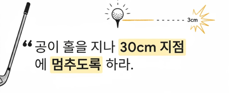 - **황금 구역 목표:** 공이 홀컵을 지나서 **딱 30cm 뒤에 멈추게 쳐라 **.