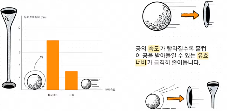 - **8cm의 기적:** 반대로, 가장 이상적인 속도로 공을 굴리면 홀컵은 8cm짜리 넓은 문처럼 보입니다. 이 속도에서는 공의 운동 에너지가 홀컵 가장자리에 닿는 순간 회전하는 힘으로 바뀌어 홀컵 안으로 쏙 빨려 들어갑니다 .