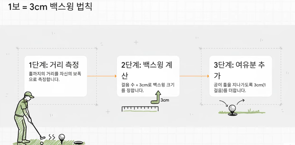 - **둘째 (거리 공식):** 내 **한 걸음이 백스윙 3cm**라는 공식을 활용하십시오