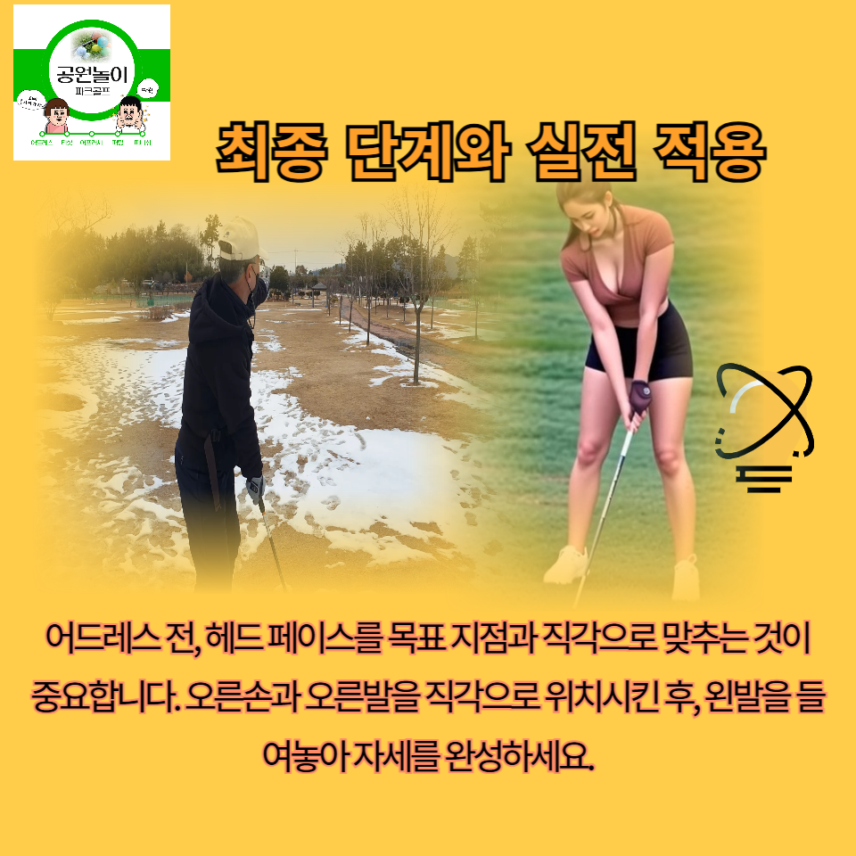 어드레스 전, 헤드 페이스를 목표 지점과 직각으로 맞추는 것이 중요합니다. 오른손과 오른발을 직각으로 위치시킨 후, 왼발을 들여놓아 자세를 완성하세요.