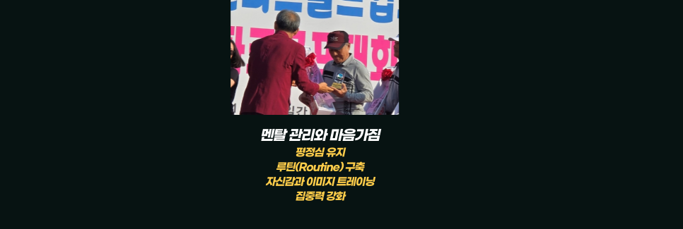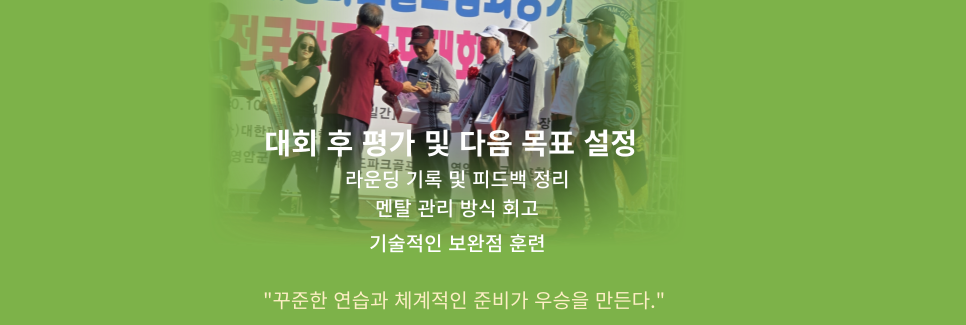 대회 중 압박감 속에서 어떻게 대처했는지, 루틴을 잘 유지했는지 점검하고 보완할 점을 찾아야 합니다.
