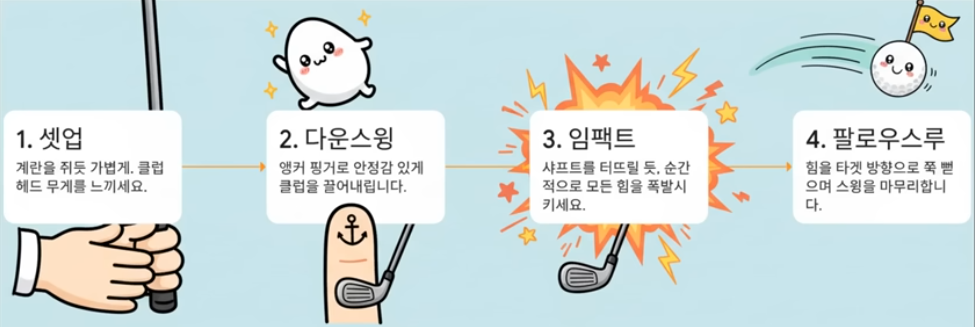 - **임팩트:** 클럽 헤드를 터트려버리겠다는 기세로 모든 힘을 **순간적으로 꽉 쥐는 겁니다**.