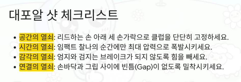 - **셋업:** 깃털처럼, 날계란을 살짝 쥐듯 아주 **가볍게** 잡습니다