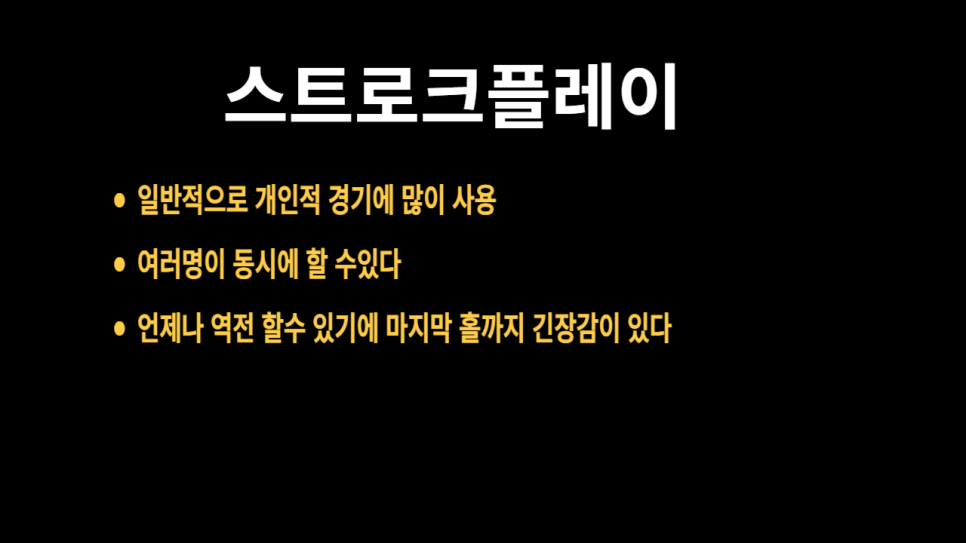- 스트로크 플레이: 꾸준한 연습과 집중력이 중요합니다.