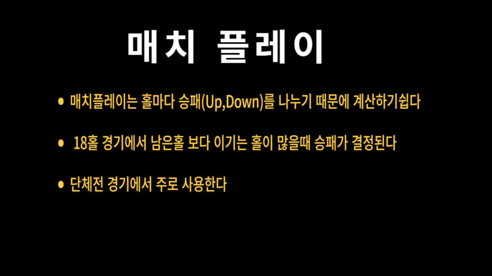 매치 플레이는 각 홀마다 승자를 가리는 방식으로 진행됩니다. 한 홀에서 상대보다 적은 타수를 기록하면 ‘1 업’, 반대로 많으면 ‘1 다운’이 됩니다. 동점일 경우 ‘올 스퀘어’로 표시되며, 경기 종료까지 이기는 홀이 남은 홀 보다 많으면 승리하게 됩니다.
