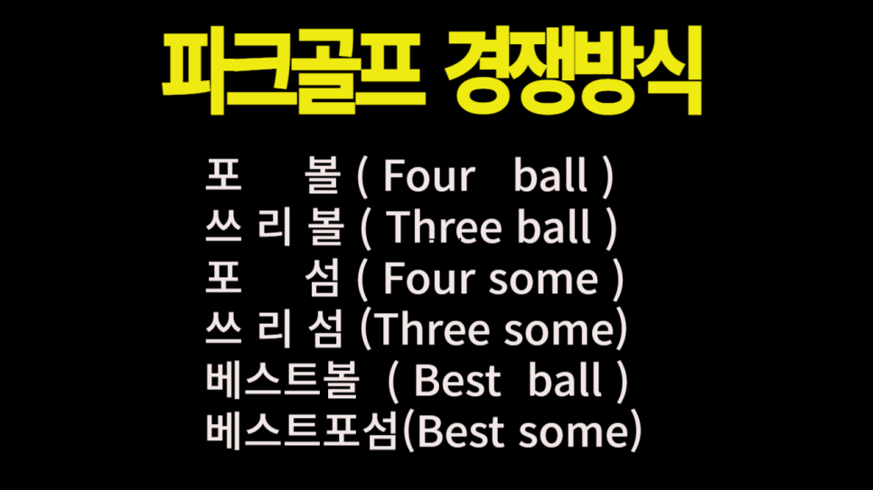 - 쓰리볼은 팀을 3:1 포볼은 2:2로 나누어 선수들이 각자 자신의 공을 관리하며, 홀 아웃까지 각자의 공으로 플레이를 끝내고, 두 명 중 한 명의 스코어가 좋은 것으로 선택하여 홀 승정을 결정하는 것입니다.