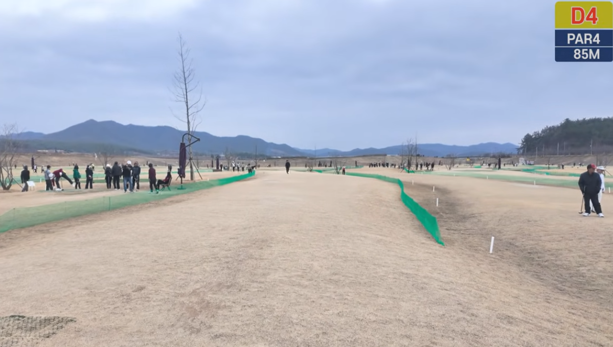D-1번홀(Par 4)은 좌측으로 휘어지는 도그렉 형태를 띠고 있지만, 좌측 공략은 100% 오비(OB)를 유발합니다. 현지 고수의 분석에 따르면 무조건 우측 망을 겨냥해 치는 '망치기' 전략이 유효하며, 약 70m 정도의 강한 티샷으로 우측 경사면을 맞혀 공을 안쪽으로 굴려 넣는 지혜가 필요합니다.
